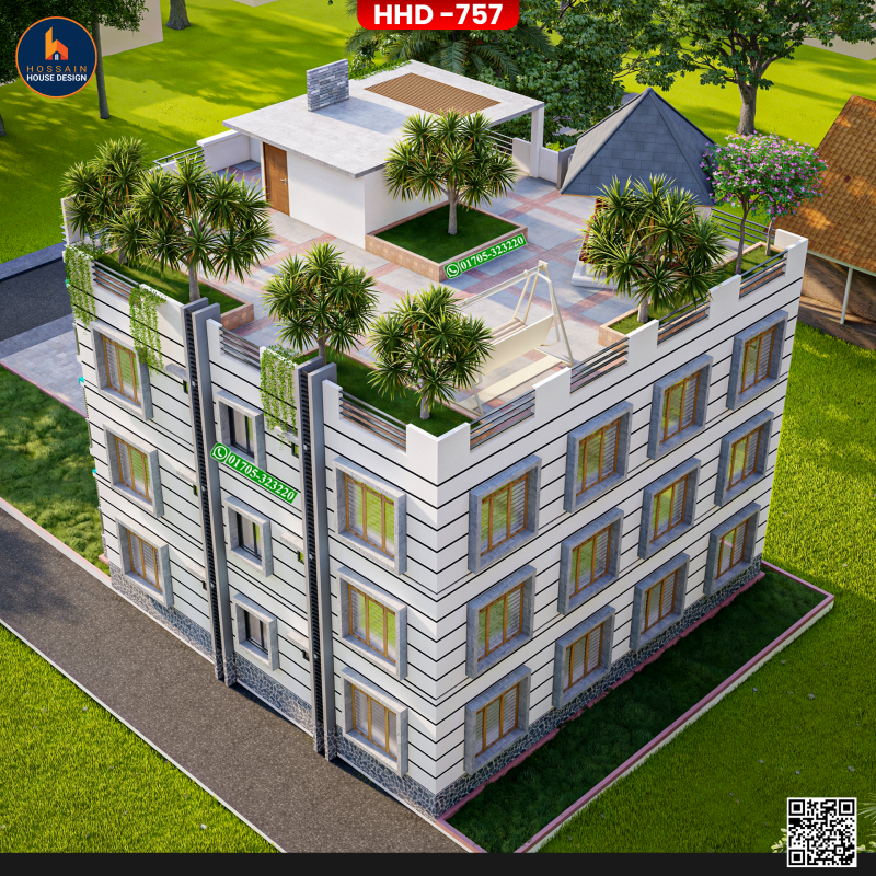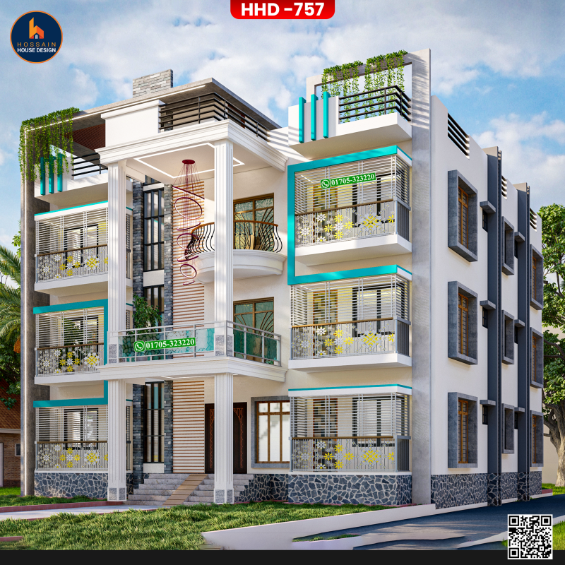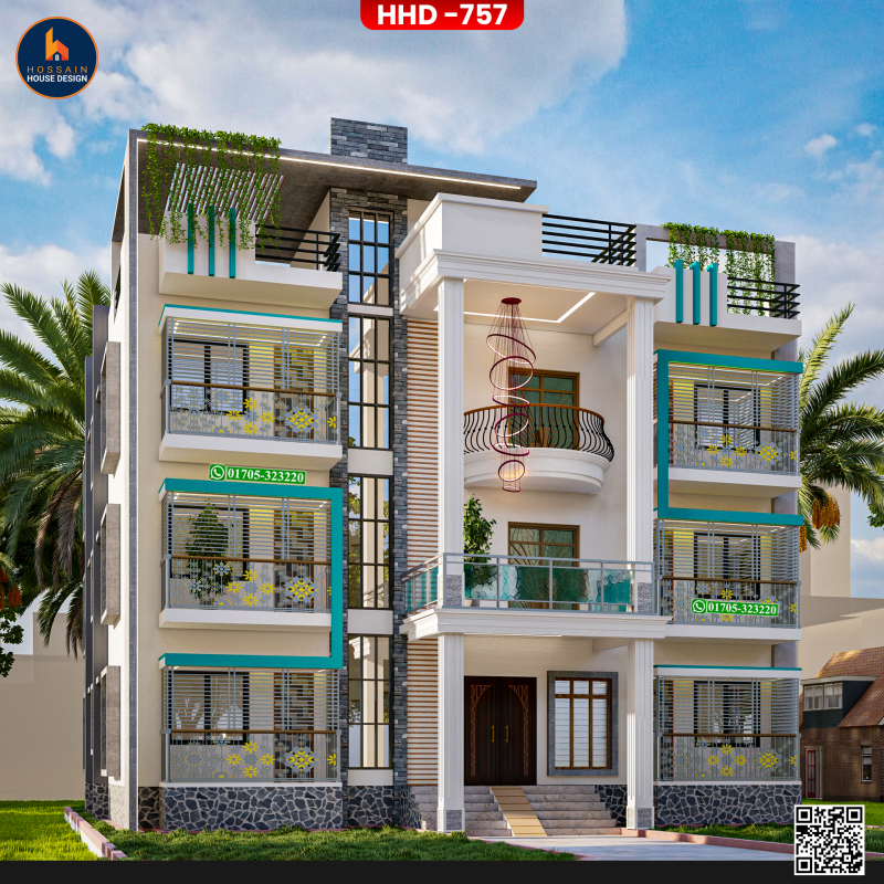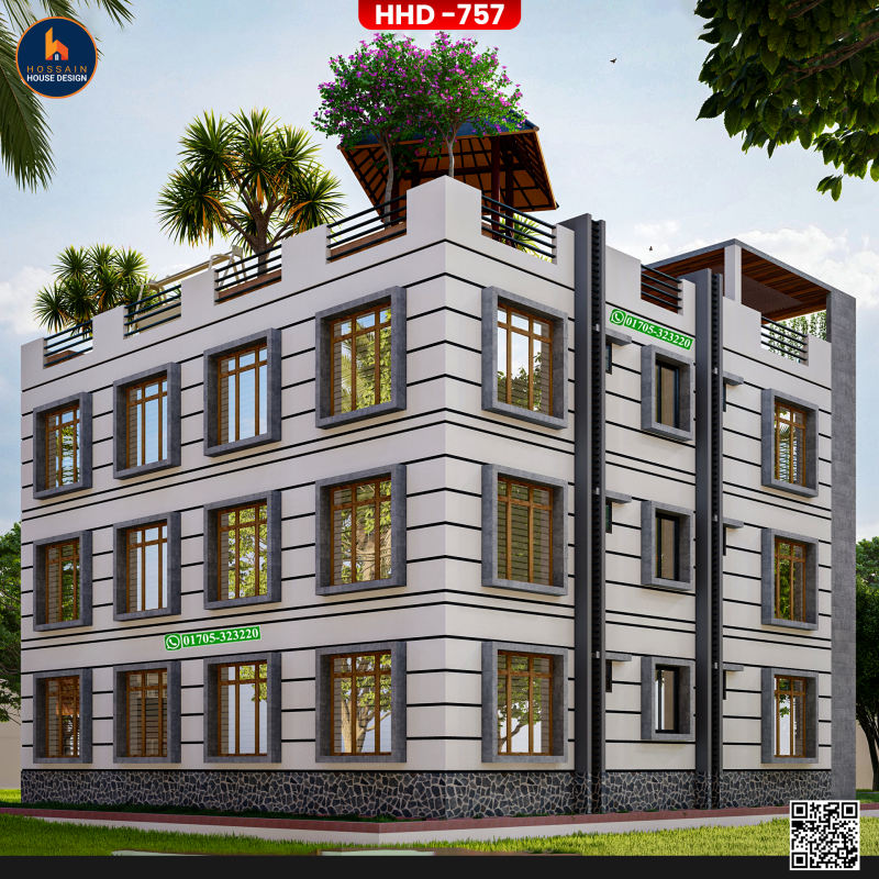 HHD 757 is a luxurious triplex house design located in Rohitpur, Keraniganj, crafted for families seeking a spacious and elegant 3-storied residential solution in Bangladesh. With a bold architectural style and well-optimized space planning, this premium design blends modern aesthetics with functionality—perfect for urban and semi-urban living.